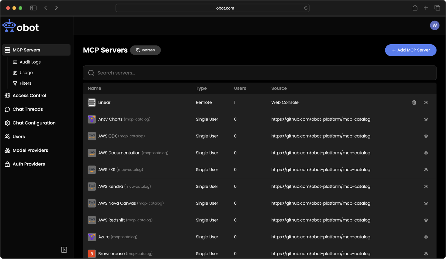 Obot is built for all of these teams. IT admins use Obot to onboard, secure and manage MCP Servers. Developers access authorized MCP servers via the Obot Catalog. Business users can interact with MCP servers safely by accessing a curated list of MCP servers via the catalog and connecting them to their preferred MCP chat client, or access them via the Obot Chat interface.